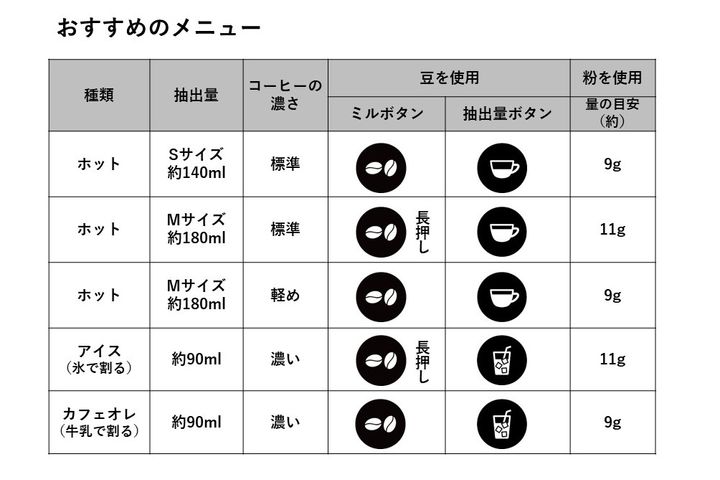 操作もシンプル。豆の量や水の計量は不要! ボタンを押すだけで、ホット標準(S・Mサイズ)、ホット軽め、アイス、カフェオレの5種類のメニューから選べます。しかも、すでに挽いた粉を使うことも可能だから、その日の気分に合わせて楽しめるのがうれしい。