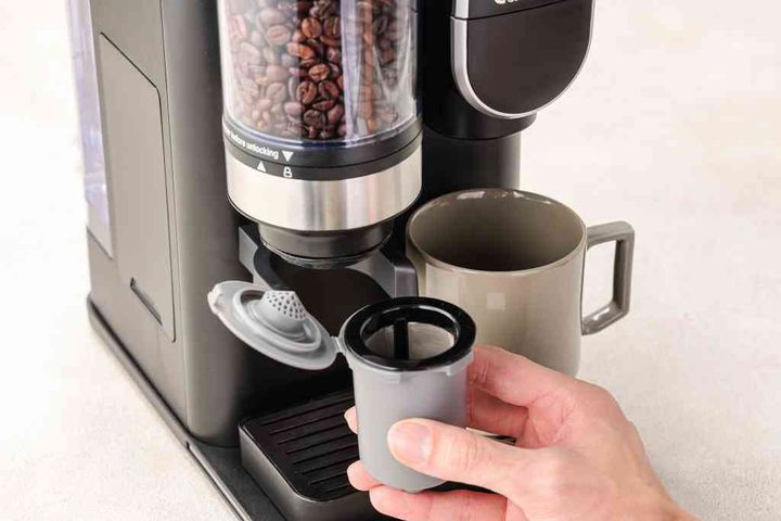 この「ドリップワン」には、コニカル式のミルが搭載されています。ステンレス製の円錐形状で、豆を均一に挽くことができるのが特徴。一般的なプロペラ式よりも摩擦熱が少ないため、豆の風味を損なわず、雑味のないクリアな味に仕上がります。