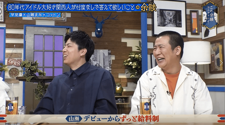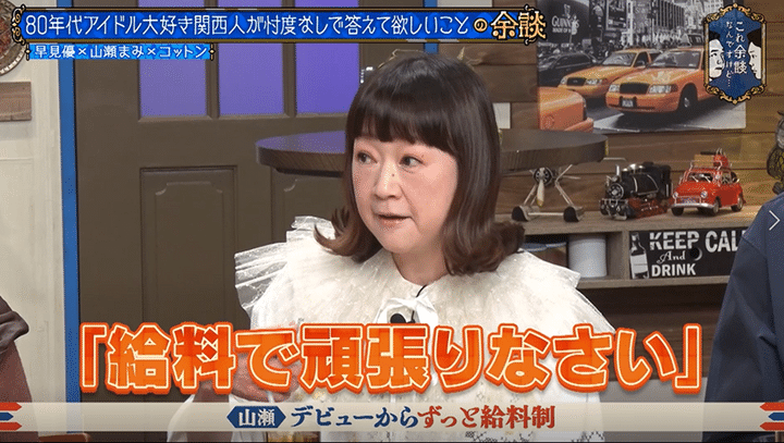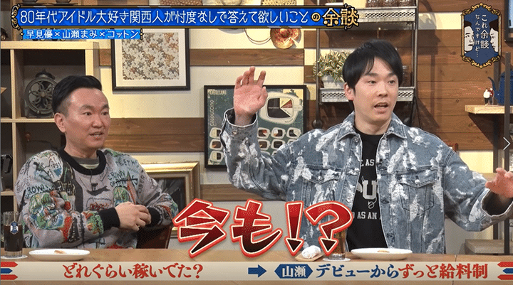 かまいたち山内の「やっぱギャラ聞きたいです。歩合制だったのか?給料制だったのか?当時のアイドルの人ってどんな感じだったんですか?」という質問に、「私はデビューしてから今もずっと給料です。だから自分のギャラとか知らないです」と答えた山瀬。「知りたいなと思った事はあるんだけど、ずっと給料だから安定してるんですよ」とキッパリ。