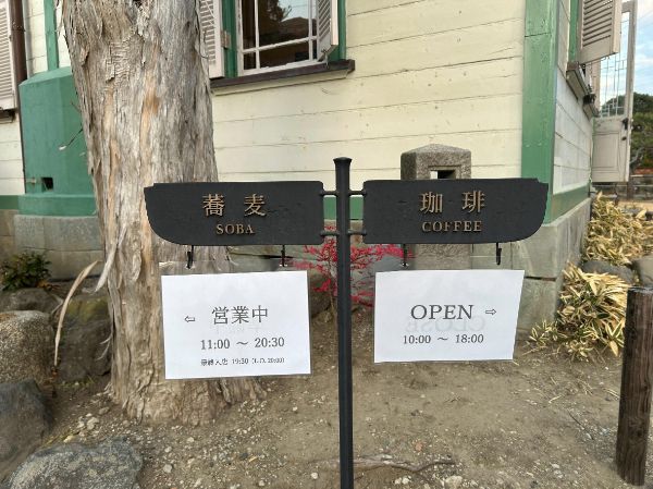 入口には表示が2つ。 洋館はカフェ、古民家は蕎麦処になっています。