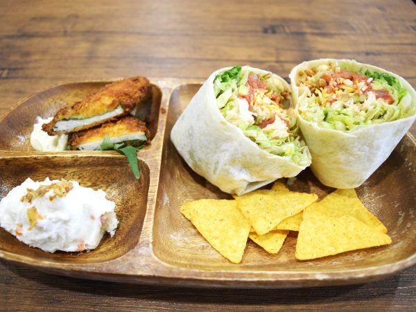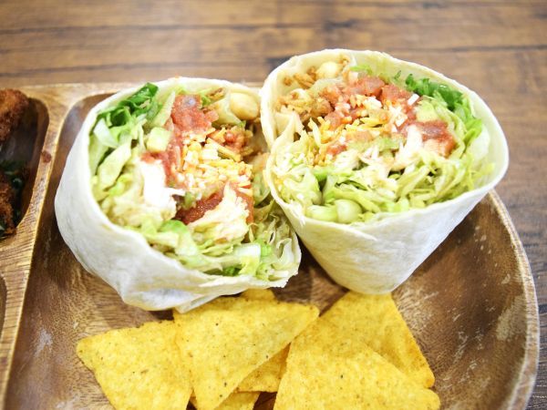 それでは、ランチに頂いたメニューをご紹介したいと思います。 この日は夫と一緒にランチに行きました。夫が食べたのは「ブリトーセット」(1500円)です。スタッフイチ押しメニューです! 「BURRITO(ブリトー)」とは、トルティーヤに具材を巻いたメキシコ料理です。メキシコでは有名なブリトーですが、「Slow(スロー)」ではたくさんの具材を入れて巻くサンフランシスコスタイルのブリトーです。野菜がたっぷり使用されておりヘルシーなのに食べ応えのある一品です。夫もサンフランシスコスタイルのブリトーは初めて食べたのですがおいしいと喜んで食べていましたよ。 セットにはブリトー、トルティーヤチップス、本日の一品、本日のデザートが付いています。この日の一品は鶏ささみの紫蘇フライでしたよ。ブリトーのソースはサルサソース、ハニーマスタード、チリマヨネーズなどがありましたよ。お好きな種類を選んでくださいね。本当はアルミホイルに包まれていて、少しづつ剥がしながら食べるのがオススメなのですが今回は撮影のためにアルミホイル無しでカットしていただきましたよ。