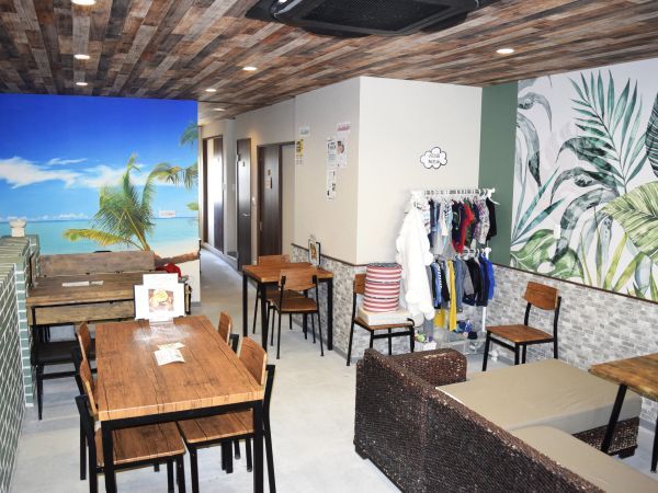 それでは「Slow」の店内をご紹介したいと思います。店内はアメリカ西海岸をイメージしたかのようなインテリアで明るい雰囲気です。海やグリーンの壁紙が爽やかな空間を演出してくれています。座席のテーブル席以外にもゆったりとしたソファー席もありますよ♪