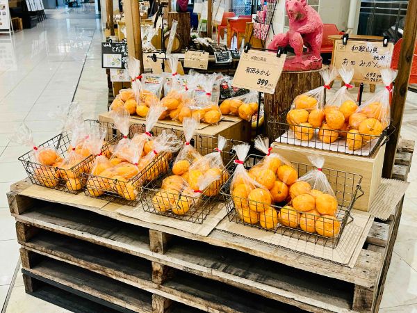 お店の前ではフルーツや野菜が並ぶこともあり、新鮮な食材を購入できます。