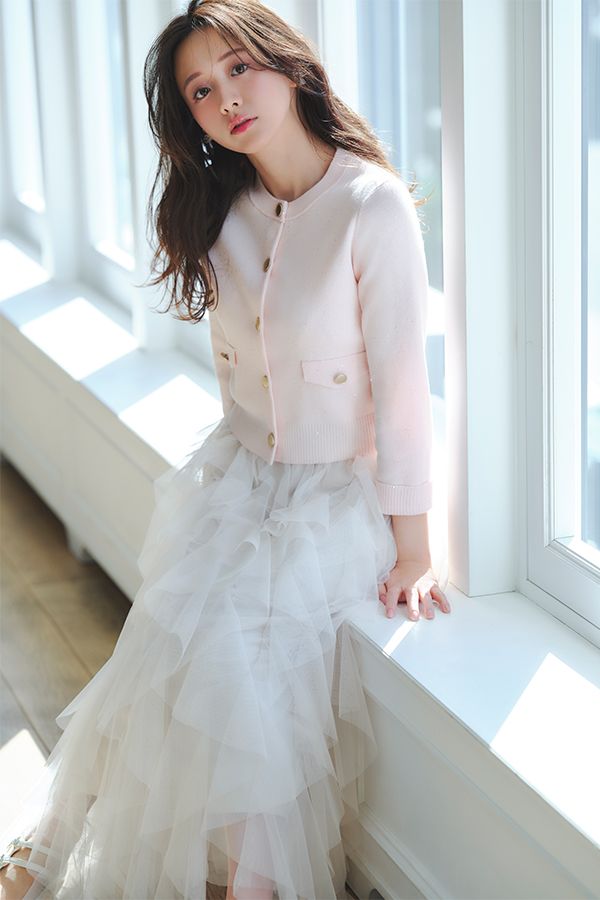 日差しを浴びるたび、キラキラときらめく淡いピンクのニットカーデが大人キュート♡ フリルチュールをたっぷりとあしらった白スカートと合わせることで、カーデの可愛さをさらに引き立てて。