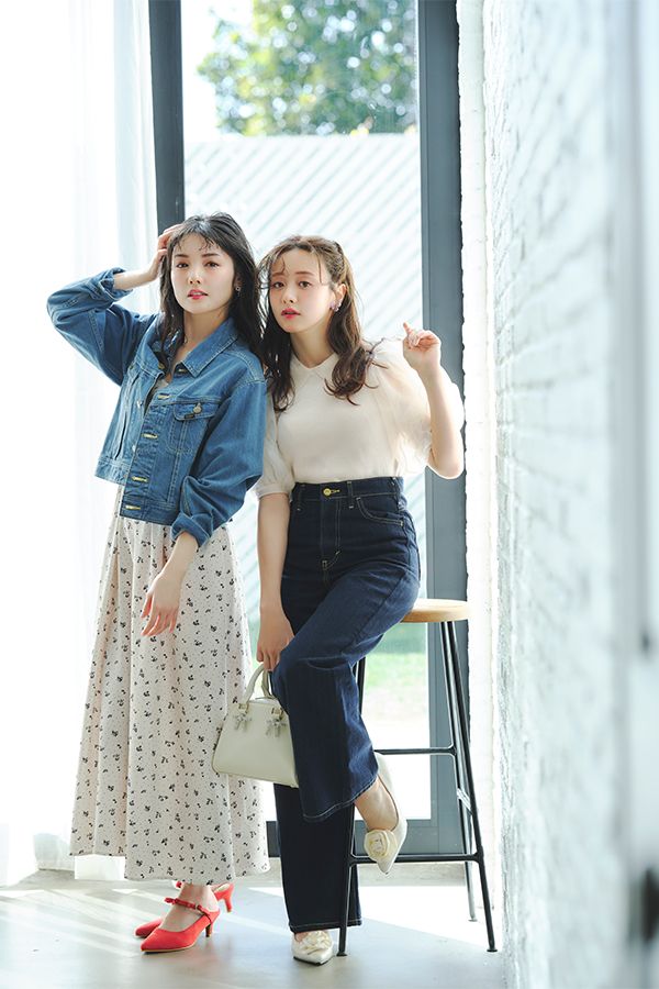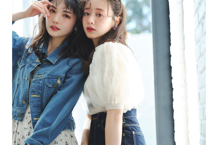 [さゆみ] プリントキャミワンピース¥13,200、リボンパンプス¥9,900、ビジューリボンピアス¥2,970/以上31 Sons de mode(ヒロタ) [香澄] 襟付きシアースリーブニット¥8,690、Leeコラボデニムワイドパンツ¥12,100、ビジューリボンボストンバッグ¥11,000、コサージュパンプス¥9,790、クリアカラーフラワーイヤリング¥2,970/以上31 Sons de mode(ヒロタ)
