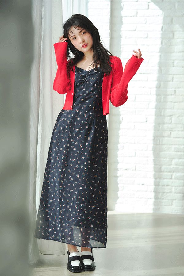 コンパクトなシルエットが今年顔な赤カーデと、ナローシルエットが大人っぽい花柄キャミワンピのセット。どちらも単品でも使い回せるから、1点取り入れるだけでコーディネートの幅がぐっと広がります。