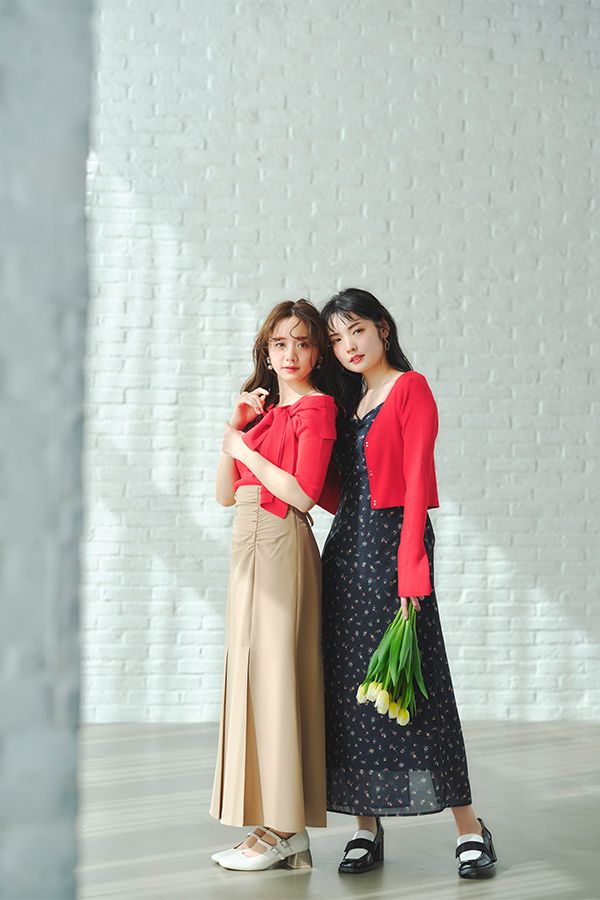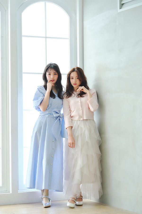 [さゆみ]ニットカーデセットキャミワンピース¥16,500、リボン付きローファー¥12,100、チェーンフープピアス¥2,970/以上31 Sons de mode(ヒロタ) [香澄]アシメオフショルリボンニット¥7,590、チュールレイヤードマーメイドスカート¥12,100、ダブルストラップメリージェーンパンプス¥12,100、ビジューパールイヤリング¥2,970/以上31 Sons de mode(ヒロタ)
