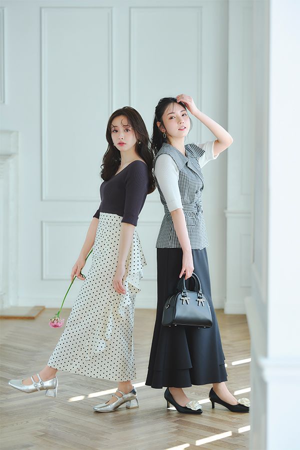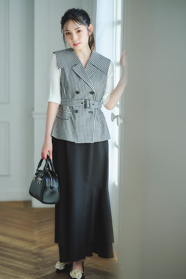 着るだけで今年らしいスタイリングが叶うギンガムチェックのジレとマーメイドスカートのセット。ジレのベルトマーク&ペプラムヘムはスタイルアップ効果も期待大。着こなしに奥行きを添えてくれるスカートのティアードディテールも◎。