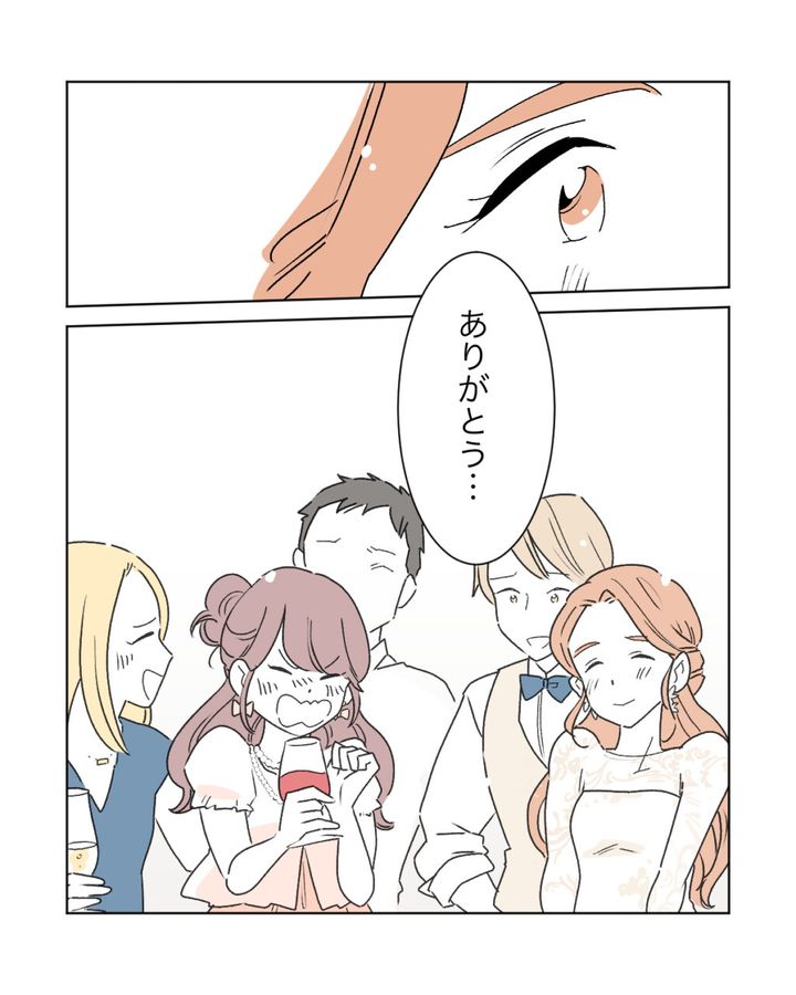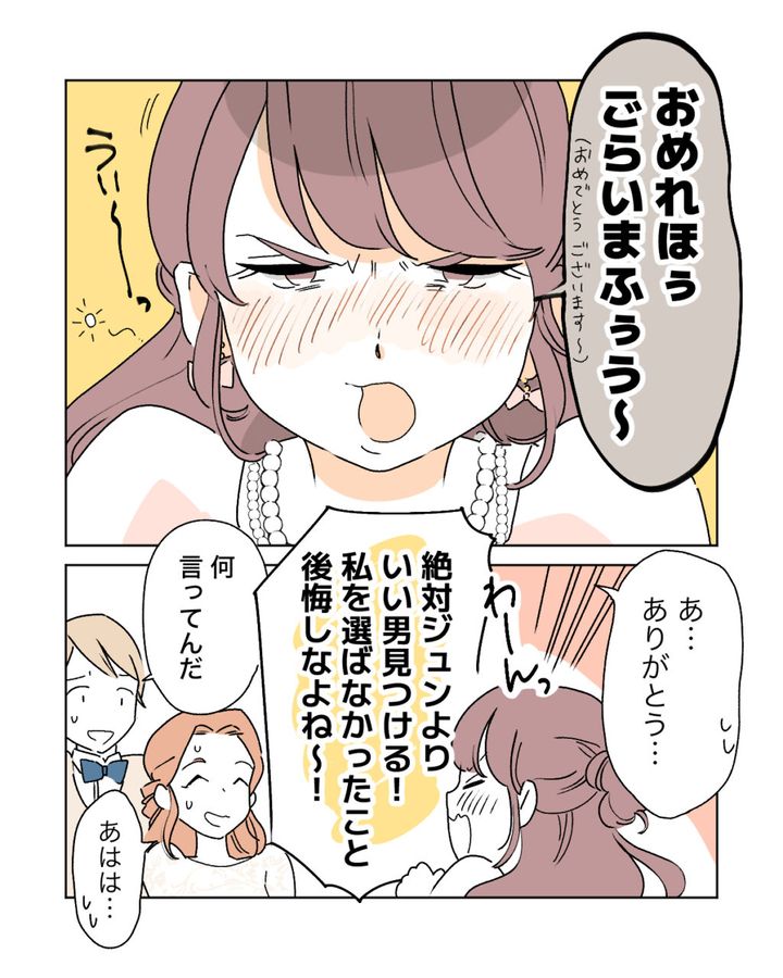 ジュンと一緒にゲストのもとを回っていると、すっかり出来上がって真っ赤な顔のユリちゃんが「おめれほぅごらいまふぅう~(おめでとうございます~)」と声をかけてきました。「絶対ジュンよりいい男見つける!私を選ばなかったこと後悔しなよね~!」と宣言するユリちゃんに「何言ってんだ」とジュンは呆れ、私は「あはは・・」と苦笑い。