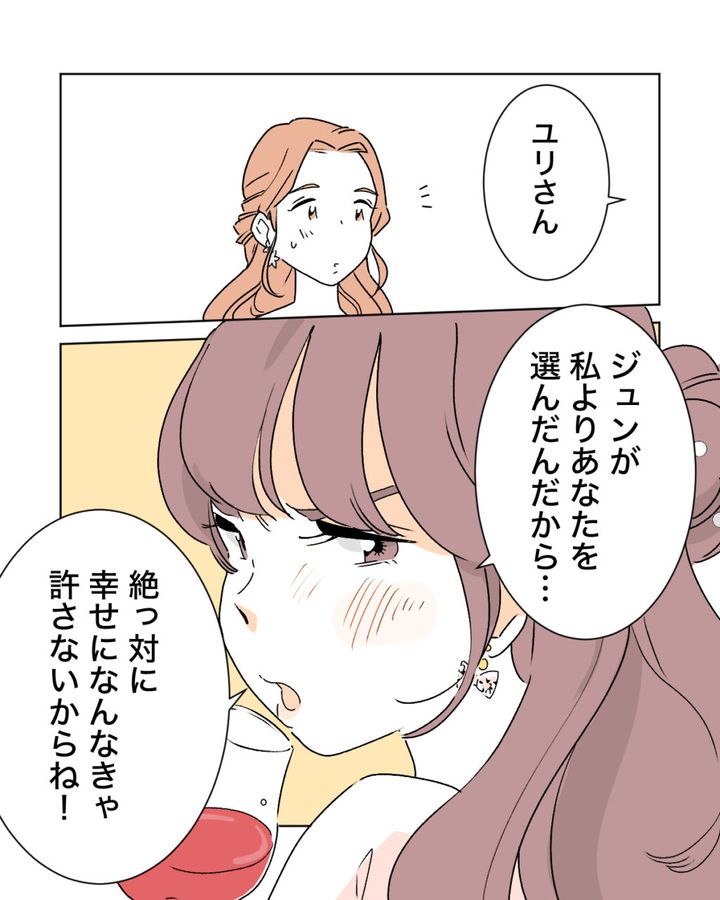 すると、酔っぱらっていたユリちゃんが突然シャキッとして、私の目をしっかり見て言いました。「ユリさん。ジュンが私よりあなたを選んだんだから・・絶っ対に幸せになんなきゃ許さないからね!」