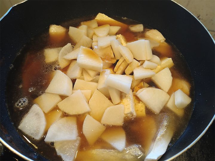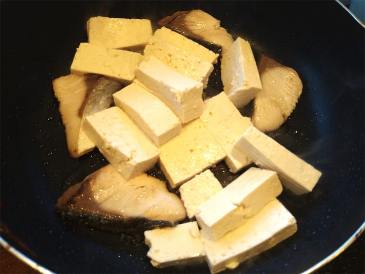 4. 酒を振り、豆腐を加えたら、2の大根を調味液ごとフライパンに入れる。