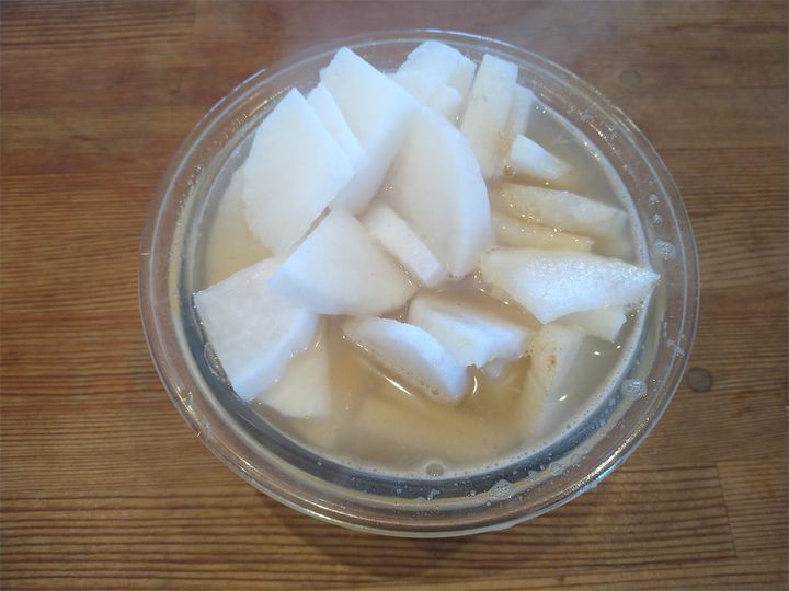 2. 耐熱容器に1の大根と[A]を加える。ラップをかけて、600Wの電子レンジで5分加熱する。