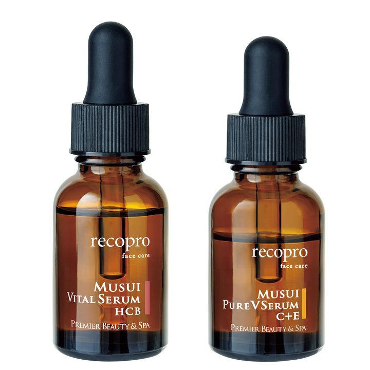 左から:臍帯血幹細胞順化培養液配合で肌が自ら育つ力をサポート。MUSUI バイタルセラム HCB 20ml ¥33,000、ピュアビタミンCを配合。無水処方でビタミンCを安定化。MUSUI ビュアVセラムC+E 15ml¥25,300(ともにプレミア・ビューティ・アンド・スパ)