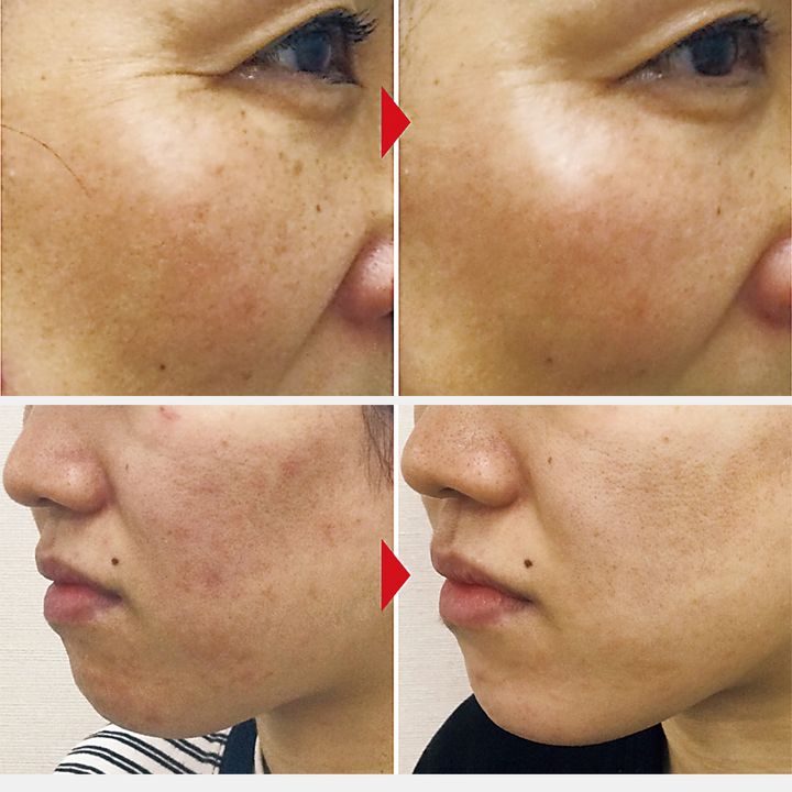 上:54歳女性の1カ月の使用経過。目尻のシワや頰のシミが薄くなり、頰にはハリ感が。下:30歳の女性の1カ月の使用経過。毛穴の開きや頰全体の赤みが軽減。全体的にトーンアップした肌印象に。