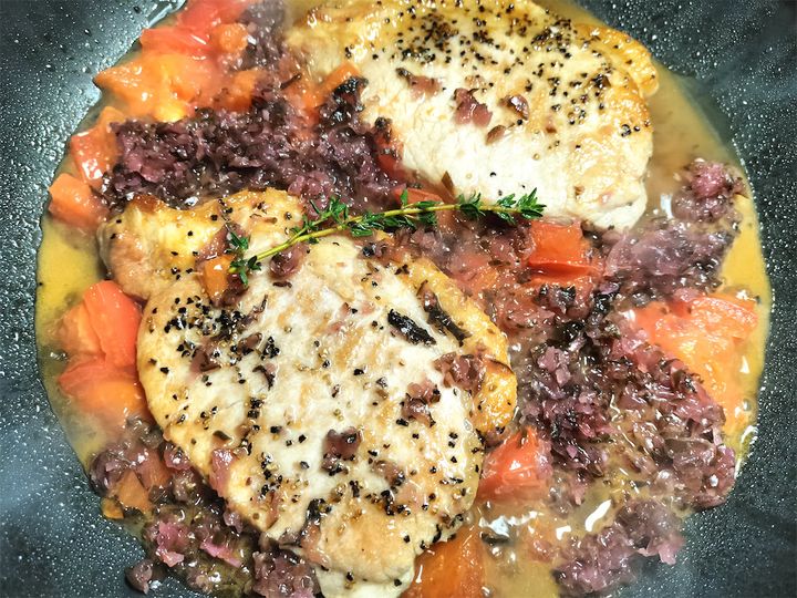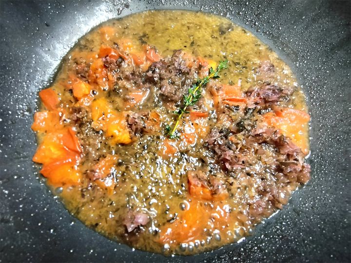 3. 余計な油を取り除いてからトマト、白ワイン、タイムを加えてフタをし、中火で火が通るまで蒸し煮にします。