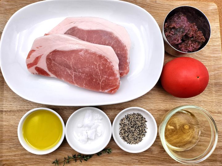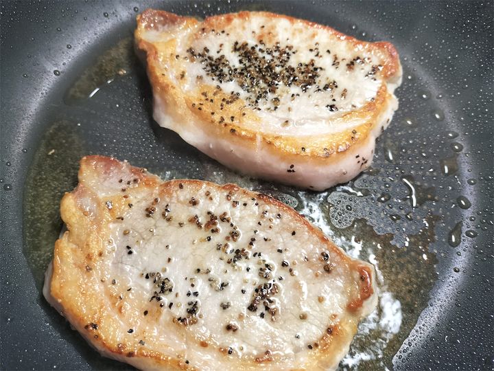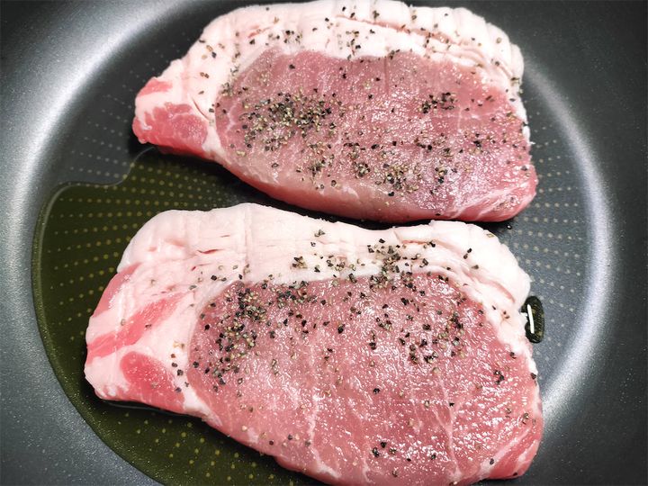 1. フライパンにオリーブオイルを引き、両面に塩と黒こしょうを振った豚肉を入れて強火で焼きます。
