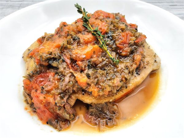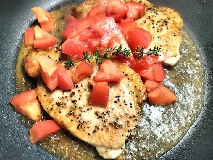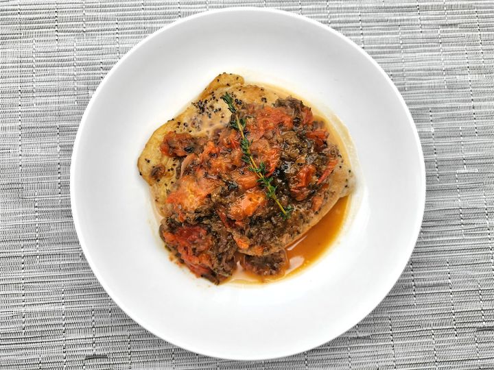 立ち上るいい香りをかぎながら肉を口に入れると、しっかりと焼き目がついているので香ばしいのに蒸し煮にしているおかげで肉が柔らかく、マスタードなど他の酸味や辛みのあるソースとは全く違う風味が鼻に抜けてきます。塩と黒こしょうだけのソテーだけでもおいしいのですが、トマトの酸味とタイムの香り、そしてトマトとは別の酸味と食感を持ったしば漬けを加えることで、知っているソテーとは全く違うソテーになっていました。まさかと思いましたが、この組み合わせはありです。
