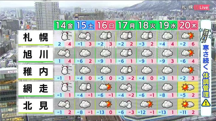 ※13日午後5時時点の情報です。最新の気象情報は、HBCウェザーセンターのホームページなどでご確認ください。HBCは気象庁の認可を2001年に得て以来、民間気象会社の一つとして「HBCの独自予報」を発信しています。