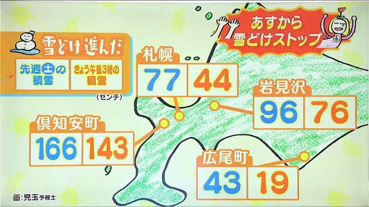 今週は気温が高くて、雪どけが進んでいます。こちらは各地の積雪の状況です。左の数字は先週土曜日、右はきょう3月13日(木)午後3時の積雪です。札幌は77センチが44センチと30センチ以上減りました。先週大雪となった十勝の広尾町でも43センチが19センチになりました。ただ、あす14日(金)から雪どけはストップ…どころか増えていく地域もあります。