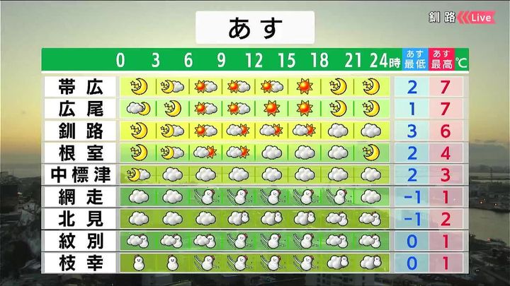 オホーツク海側はふぶいて、5センチ前後の雪が降りそうです。帯広は7度まで気温が上がりますが、その他は朝から気温が上がらず、寒いでしょう。