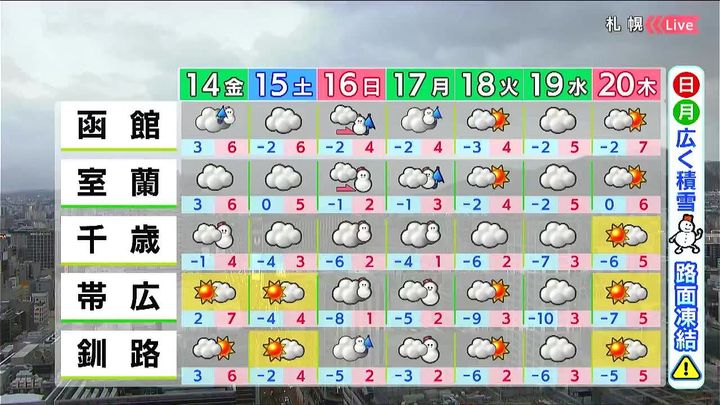 では、週間予報。日本海側とオホーツク海側からです。15日(土)は、石狩湾周辺や知床半島周辺で10センチ前後の雪が降るでしょう。16日(日)の夜から17日(月)にかけては広く雪となりそうです。