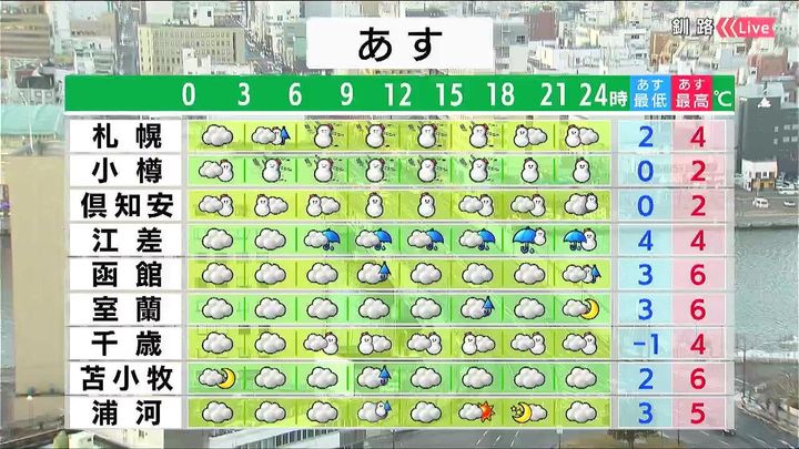 湿った雪でふぶくでしょう。あすは札幌市内の中学校の卒業式ですが、卒業証書が濡れないように気を付けて下さい。江差は雨で、千歳でも時折ふぶくでしょう。
