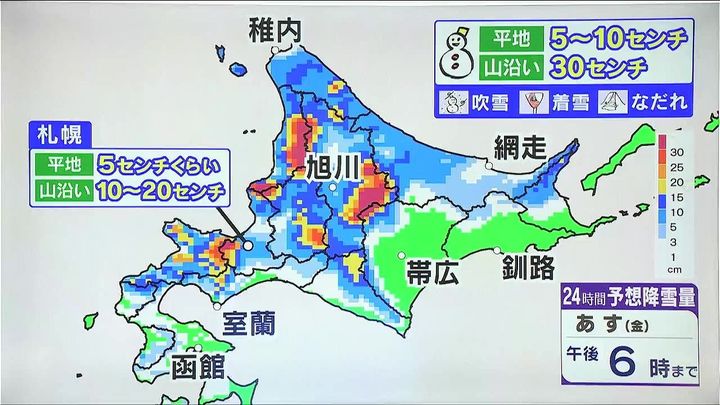 あす午後6時までの24時間に降る雪の量です。紫色、30センチくらいのところは手稲山や大雪山系など山沿いです。雪崩に注意して下さい。平地では広く5~10センチでしょう。吹雪や湿った雪による着雪にも注意が必要です。
