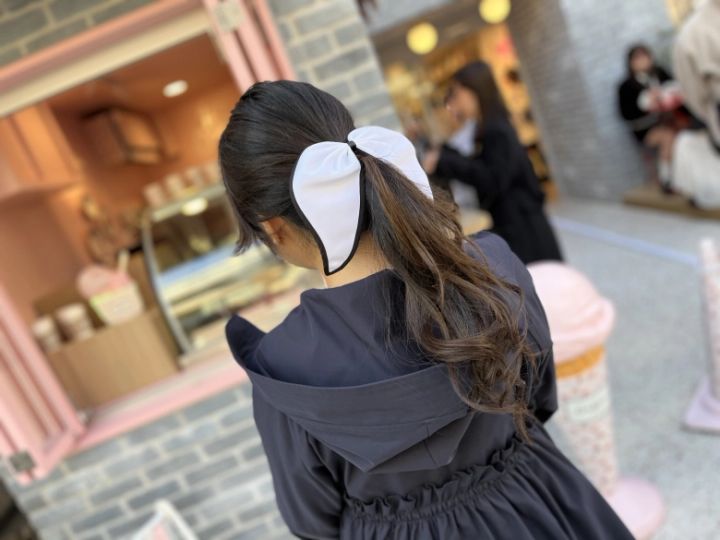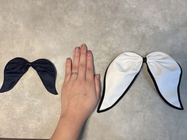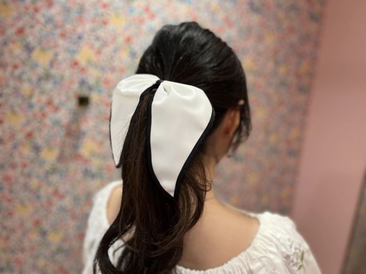 リボンの大きさはわたしの手と比較するとこんな感じ。少し大きく感じましたが、着用するとふわっと立体感も出るので、仕上がりはちょうどいいなと感じましたよ♡大きいリボンが苦手な方は、ミニサイズを試してみて!
