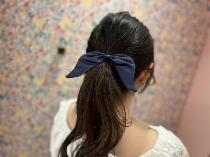 ちょっとしたセレモニーや通勤を意識してネイビーのブラウスを着用、そしてヘアスタイルはハーフアップにリボンバレッタを取り入れてみました。複雑なヘアアレンジが苦手でも、このリボンバレッタひとつで簡単にきちんと感が出るので、やっぱり絶対におすすめです!