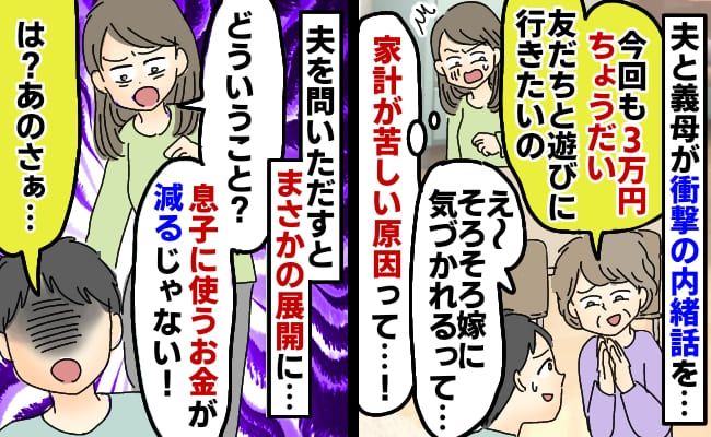 夫が休みの日に、義母が遊びに来たときのことです。台所で片づけをしていた私は、夫と義母がコソコソと内緒話をしているのに気づきました。気づかないふりをして耳をすましていると、義母が夫に小声で「今度お友だちとショッピングに行くから、今日も3万円くれないかな?」とお金を要求していたのです。夫は「いやぁ、結婚してからもずっと渡してるし、そろそろ嫁が気づきそうだよ……」と言っています。すると義母は「嫁ちゃんは私がご機嫌取っておくから、大丈夫よ!」と言い、結局夫は「しょうがないな~」と言いながらお金を渡しているではありませんか!