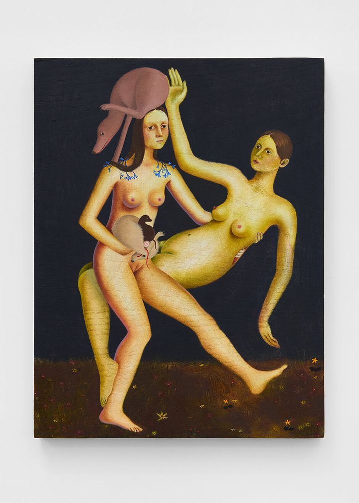 油彩画とドローイングで構成される彼女の作品には、裸の人物が動物と親密に交わる情景が描かれ、美術史の文脈と結びついた独自の関心が見て取れる。