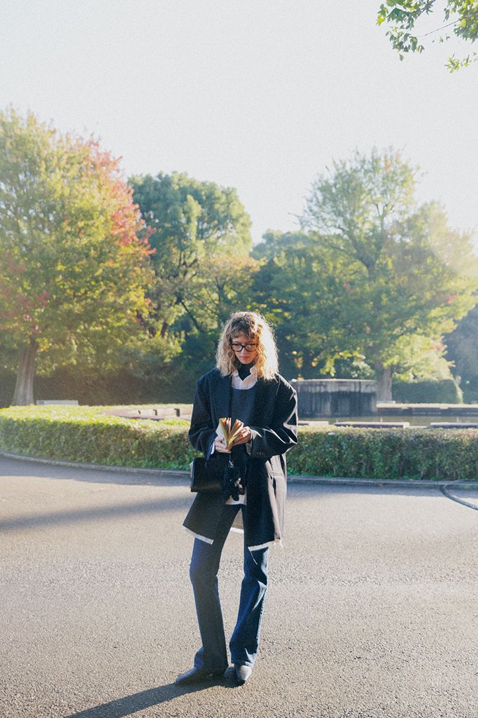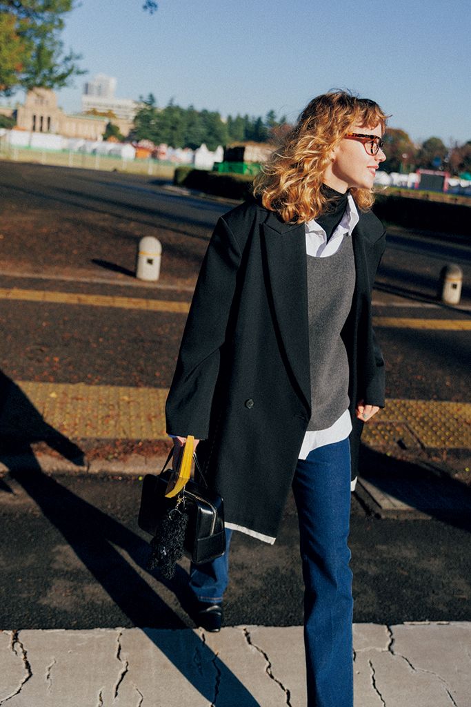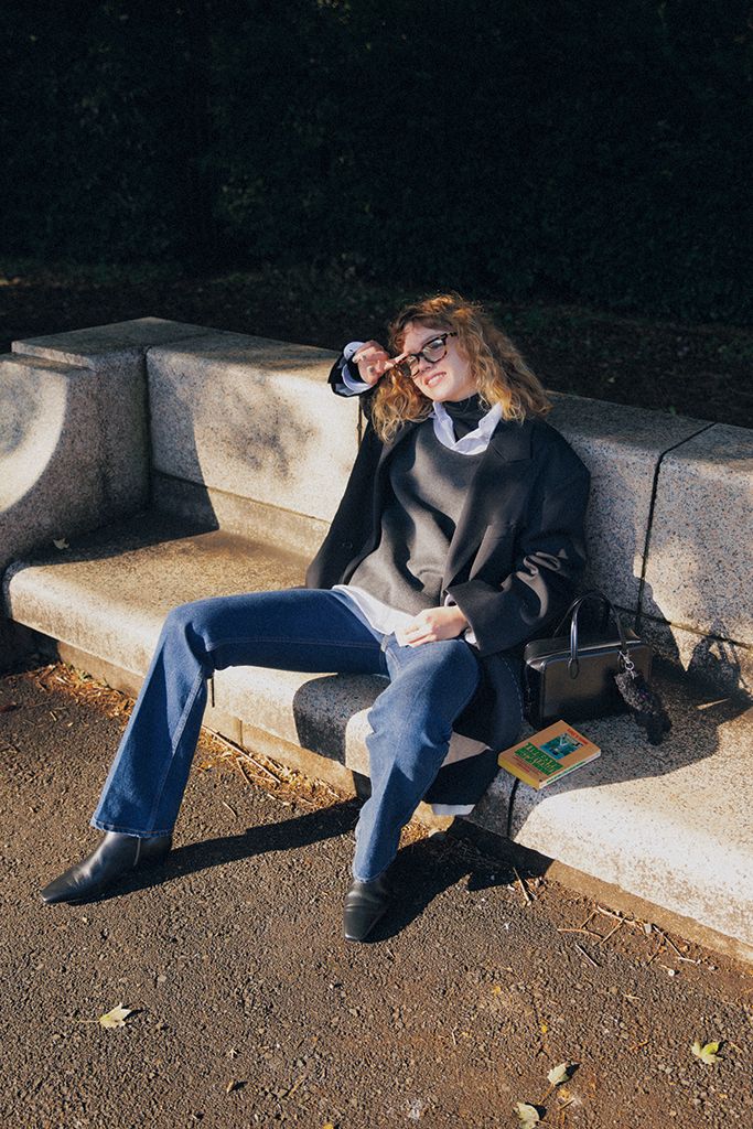 フレアデニムパンツ 25,300円/THE SHINZONE(Shinzone ルミネ新宿店) 黒ワイドジャケット 36,300円/メゾンスペシャル(メゾンスペシャル 青山店) グレーウールベスト 31,900円/プラージュ(プラージュ ルミネ有楽町店) 白シャツ 31,900円/INDIVIDUALIZED SHIRTS(メイデン・カンパニー) 中に着た黒タートル 14,300円/HER. 眼鏡 50,710円/MIU MIU(ルックスオティカジャパン カスタマーサービス) バッグ 38,900円/トゥティエ バッグにつけたチャーム 4,000円/TW ショートブーツ 45,000円/バナナ・リパブリック
