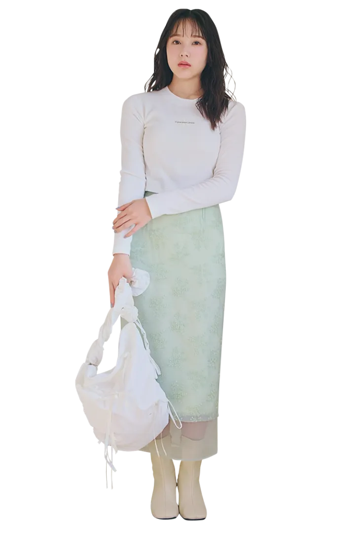 高級感のあるオーガンジーに花柄の刺しゅうがお姉さん風。コンサバ見えを防ぐには、シンプルかつカジュアルなTシャツあわせが◎。
