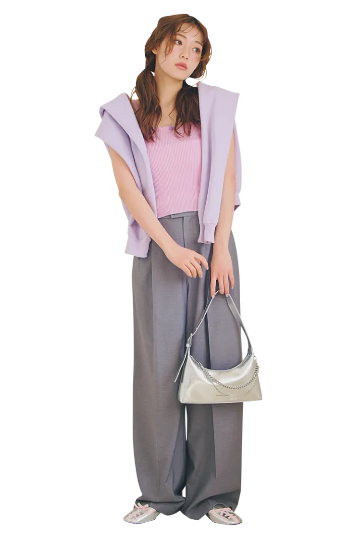 パープルキャミソール 6,380円/The Girls Society パープルパーカ 7,400円/ギルダー(ROOP TOKYO)グレーパンツ 13,750円/レイ ビームス(レイ ビームス 新宿)バッグ 10,900円、ミュール 9,900円/ともにチャールズ&キース(チャールズ&キース ジャパン)