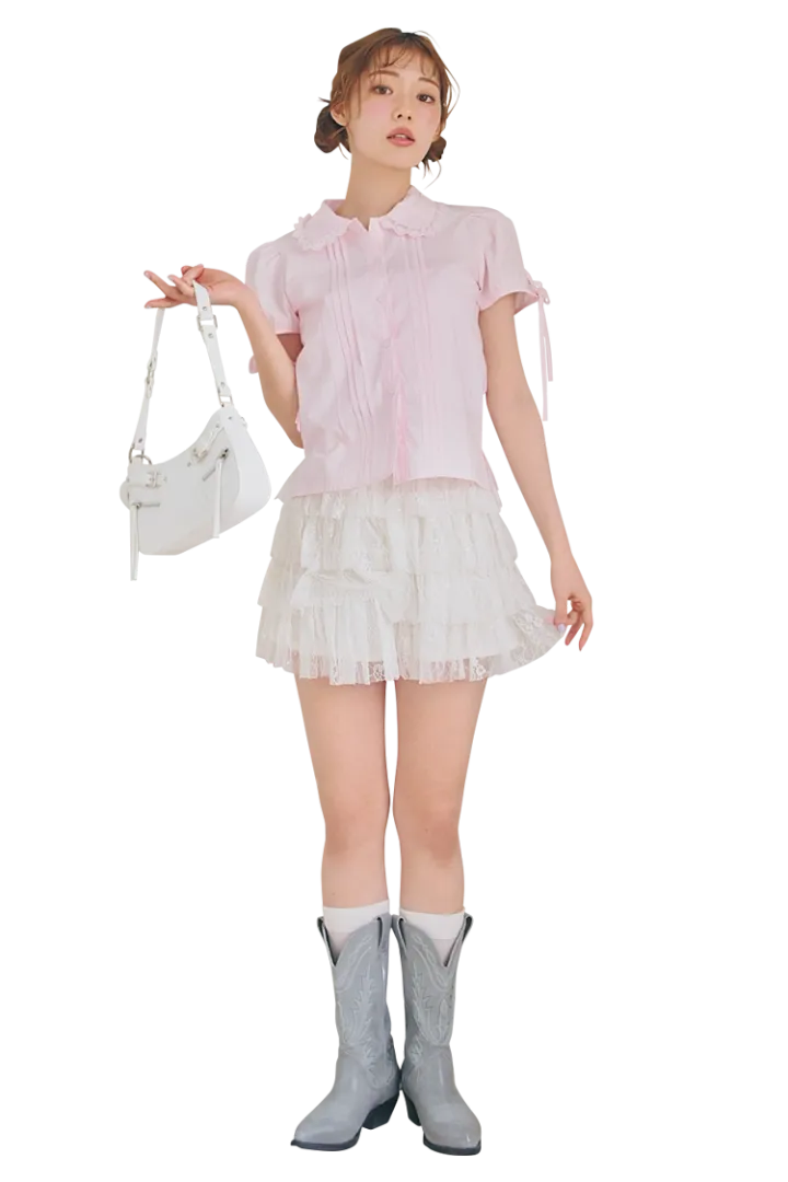 ピンクシャツ 10,780円/クランク(HANA)白レースミニスカート 9,790円/dazzlin バッグ 7,997円、ウエスタンブーツ(3月発売予定)17,380円/ともにMOUSSY(バロックジャパンリミテッド)ハイソックス 880円/靴下屋(Tabio)