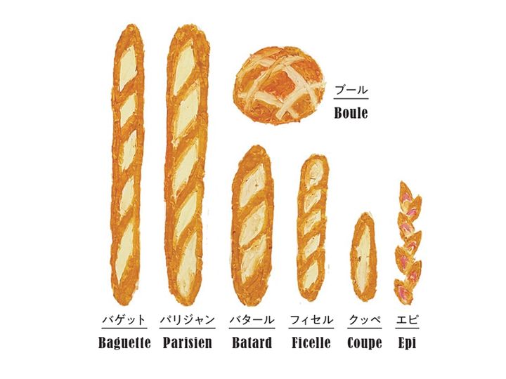 バゲットと同じく棒状のフランスパンには、バゲットよりもひとまわり太くて長さ60~70cmほどの「パリジャン」、 パリジャンと同じくらいの太さで長さ40cmほどの「バタール」、バタールよりも細くて長さ40cmほどの「フィセル」、中央に1本だけ切れ目の入った長さ20cmほどの「クッペ」などが。また、麦の穂形の「エピ」や、丸いボール状の「ブール」と呼ばれるものもあります。