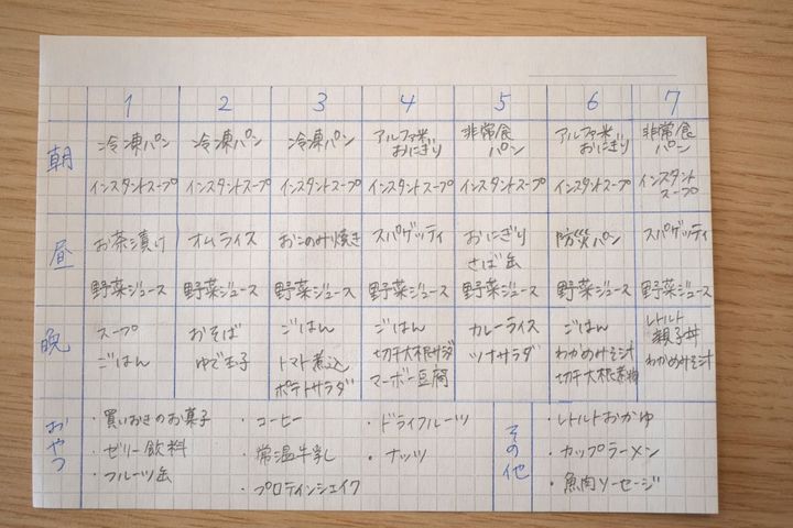 5年程度保存できる非常食もある程度用意しているので、それらも活用しながらの献立です。また、実際の被災時には、冷蔵庫の中に残っている食材を優先的に使うので、冷蔵庫の内容によって献立は変動すると思います。
