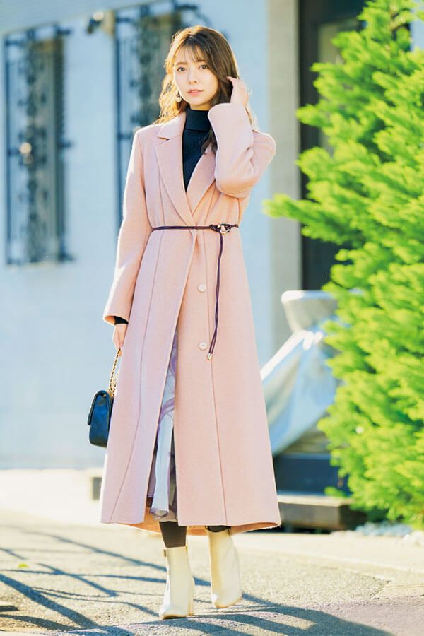 コート(ベルト2種付属)¥35,970/SNIDEL ニット¥8,910/WILLSELECTION(WILLSELECTION ルミネエスト 新宿店) スカート¥24,200/マイストラーダ バッグ¥6,919/VIS イヤリング¥27,500/Grosse(グロッセ・ジャパン) タイツ¥1,100/満足(福助) ブーツ¥29,700/タラントン by ダイアナ(ダイアナ 銀座本店)