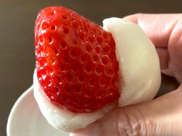 皆さん、お分かりいただけるでしょうか? ちょっと持っただけなのに押しつぶしてしまいそうなほどに柔らかいこの大福餅を・・・ 苺が重い・・なんて思う日が来ようとは・・・(^^♪