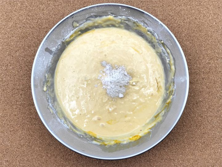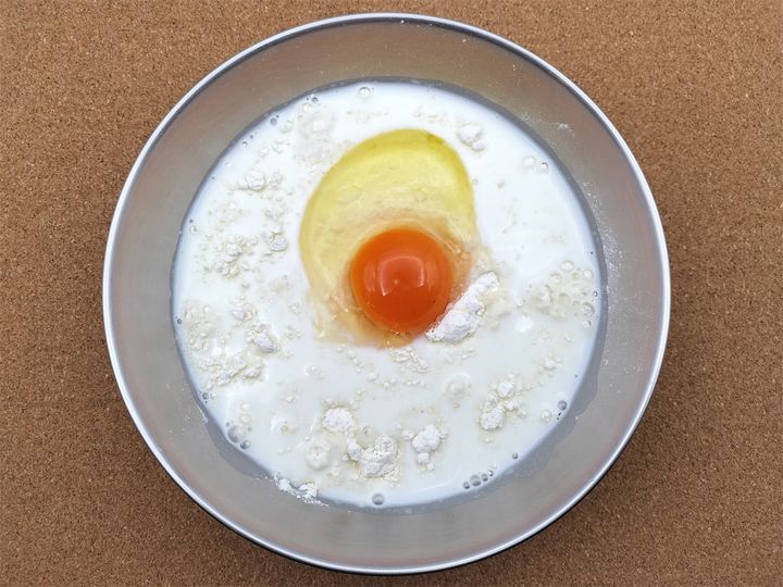 4. ボウルにホットケーキミックス、卵、牛乳を入れてよく混ぜます。