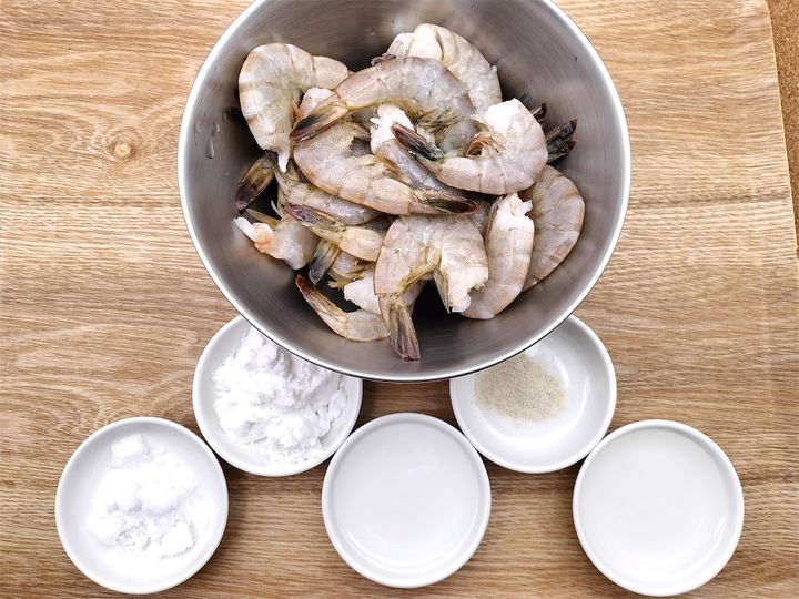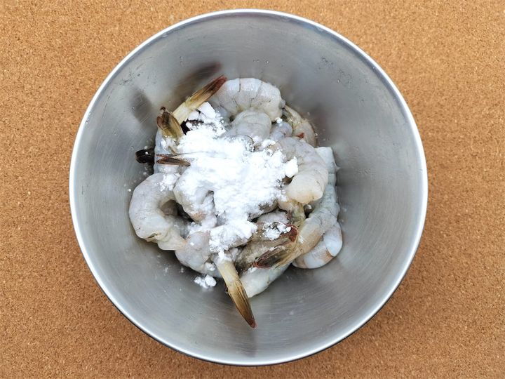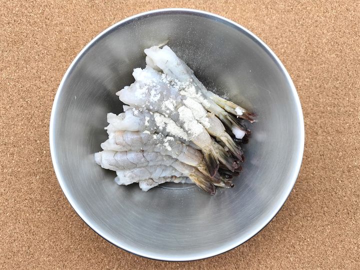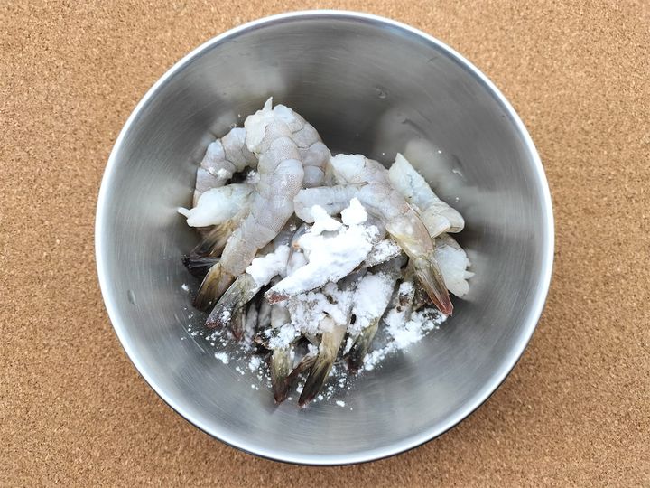 1. エビの下処理をします。ボウルにエビを入れ、塩、片栗粉ひとつまみ、水を入れてよく揉んでから水で洗い、キッチンペーパーで水気を切ります。