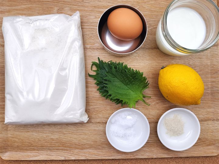 7. 器に青じそとレモンを盛りつけ、6のエビを乗せて出来上がりです。