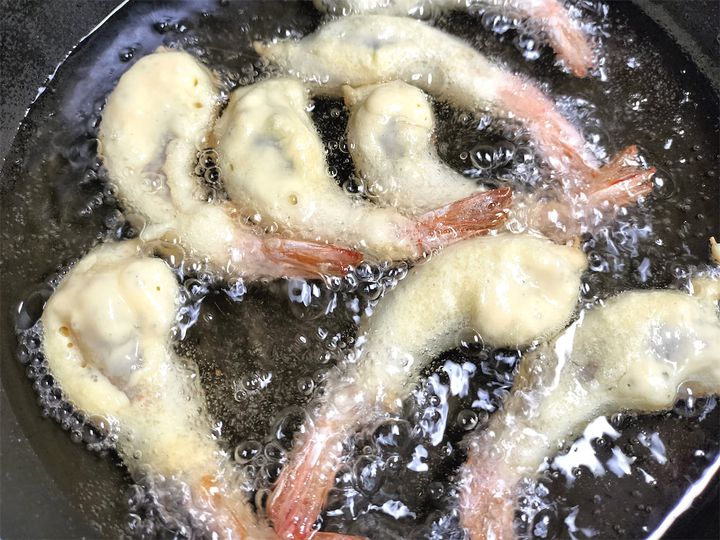 6. フライパンに揚げ油を入れます。尻尾を持ってエビに衣をつけ、170℃の油でエビに火が通るまで揚げます。揚げたらバットにあげて油を切っておきます。