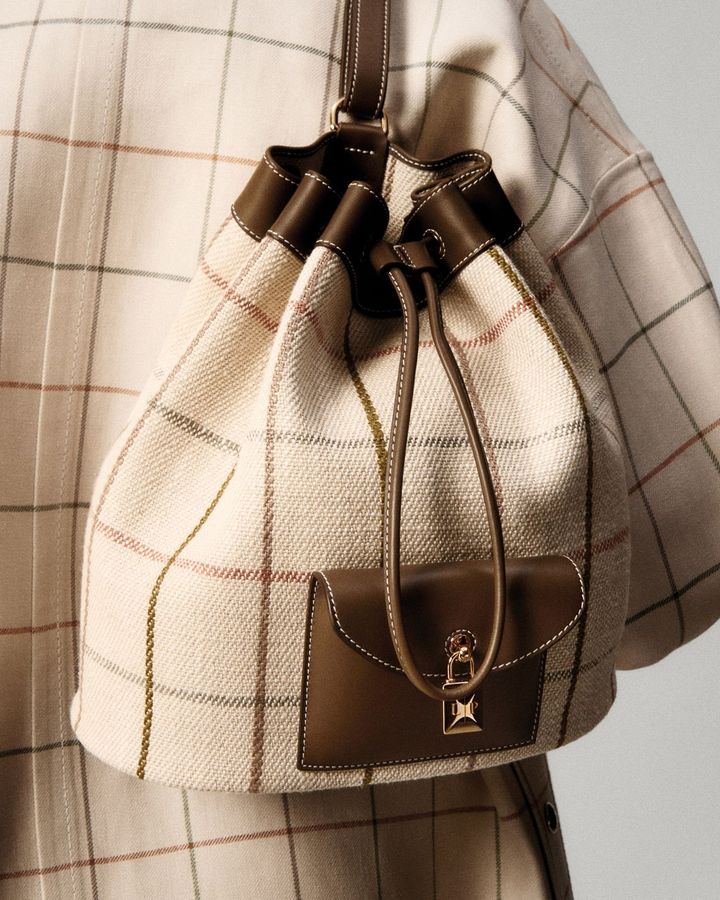 また、ドローストリング式の開閉部は出し入れのしやすさを考慮したデザインで、調節可能なショルダーストラップによってワンショルダーとバックパックの2WAYで使用可能。丸みを帯びたフロントポケットには、金メッキを施したアイコニックな立体錠が施され、控えめながらもこのブランドらしいスタイリッシュなアクセントが加えられている。