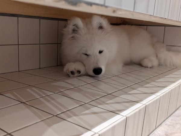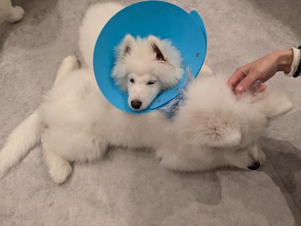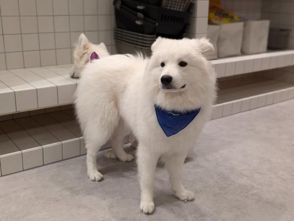 中に入るとサモエドちゃんたちがお出迎え! 動物特有のにおいが気になる方は、マスクをしていくとよさそうです。