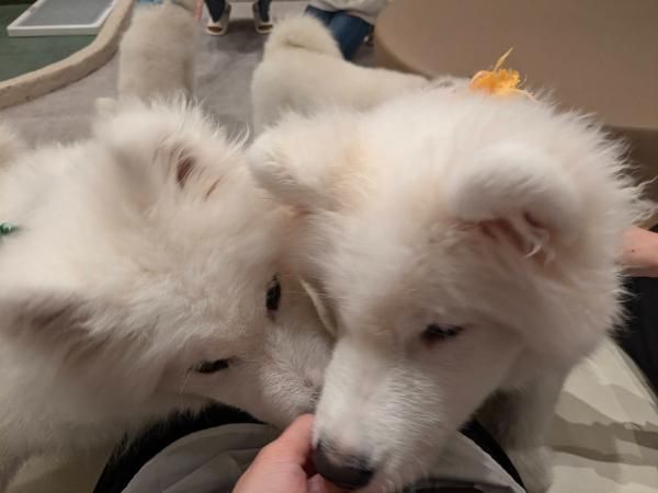 最初にもらったおやつがなくなると、サモエドちゃんたちが自由に遊び始めます。 あまり寄ってこなくて少し寂しい思いをすることも……