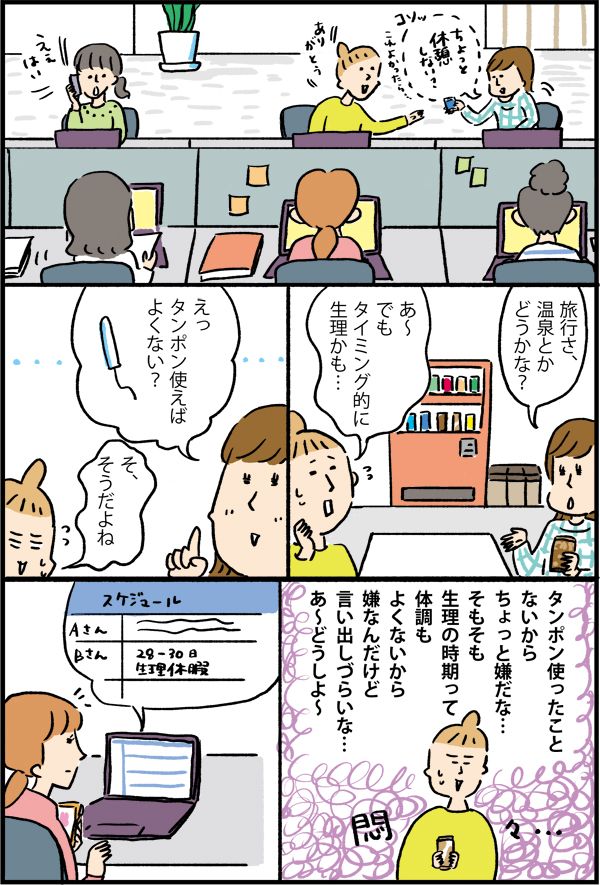 ・「生理のときはタンポンをしてプールや銭湯に行けばいい」と言われたけれど、体調も悪いんだよ…。理解してほしい。(Y.O)