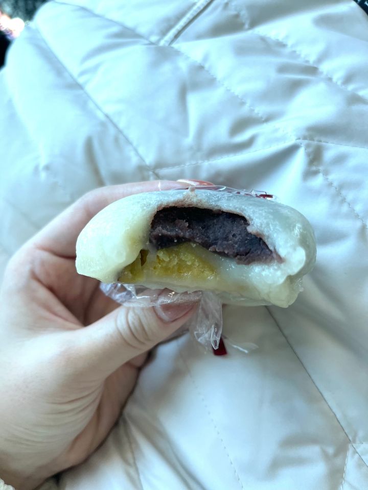 外の生地がもちもちしていて、口の中でふわっと広がる芋の甘さが絶妙。中の芋あんも濃厚でした!