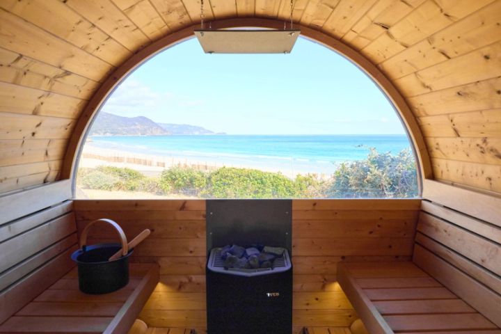 北欧エストニア生まれのバレルサウナでは、セルフロウリュも可能。天井が円形のため、ロウリュをすると蒸気が円弧に沿ってじんわり降下し、本格的なサウナ体験が楽しめます。