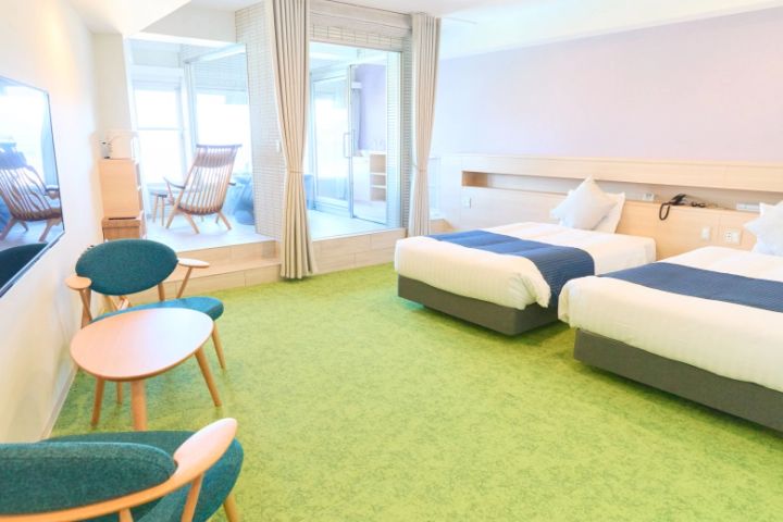 また、ホテルには敷地内から湧出する「龍神の湯」と下田蓮台寺を源泉とする「蓮台寺の湯」の2種類の温泉も。さらに、ホテルの外には海岸沿いにアウトドアサウナも完備しているんです!